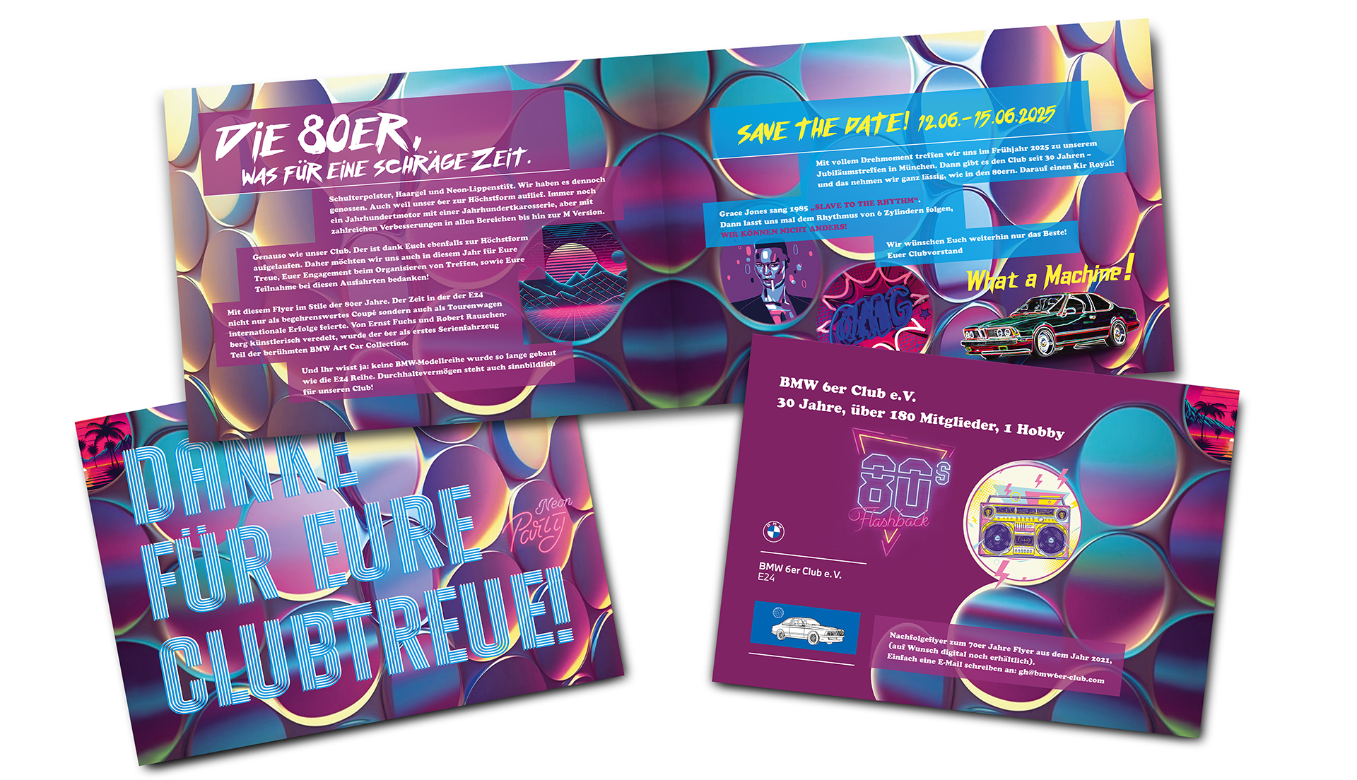„Save the Date“ - ein Einladungsflyer zum 30-jährigen Bestehen des BMW 6er Clubs. Gestaltet in einer explosiven Farbwelt der 80er-Jahre, laut, leuchtend und unübersehbar.